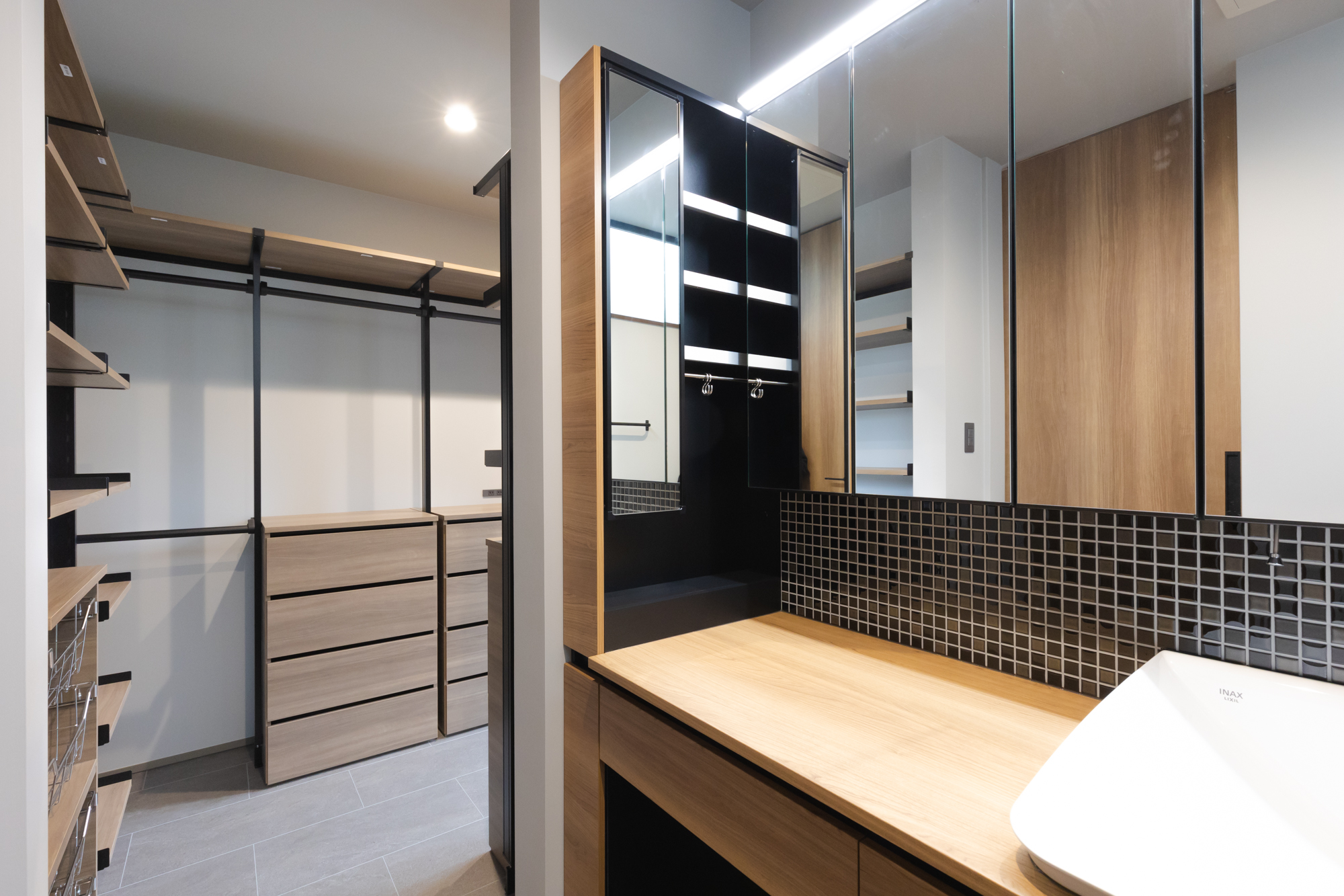 6人家族が使いやすいよう洗面台は広く設計。クローク兼ランドリールームに直結しているこの同線は家事楽になるよう考え抜かれた動線の一つでもあります。家族に比例するように収納はもちろんたっぷりと。