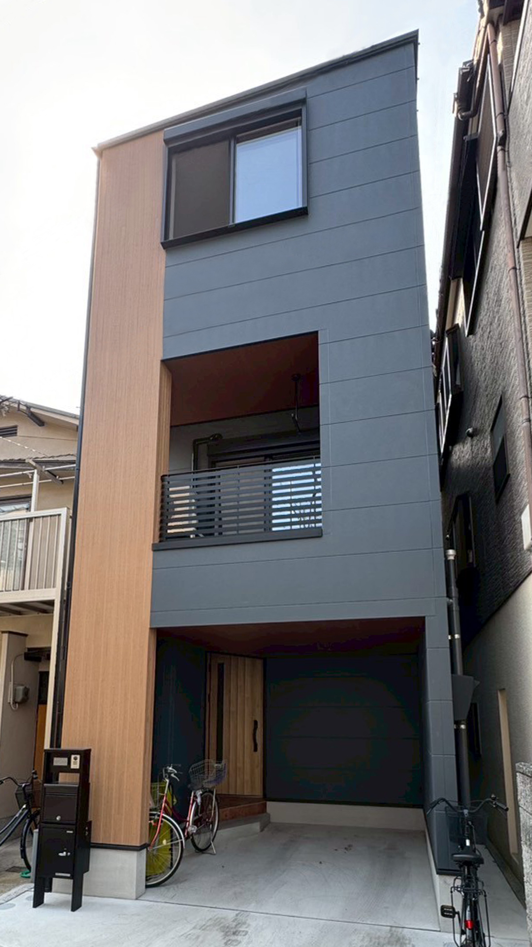 市街地で車を止めるためのスペースも確保するため、3階建てに。