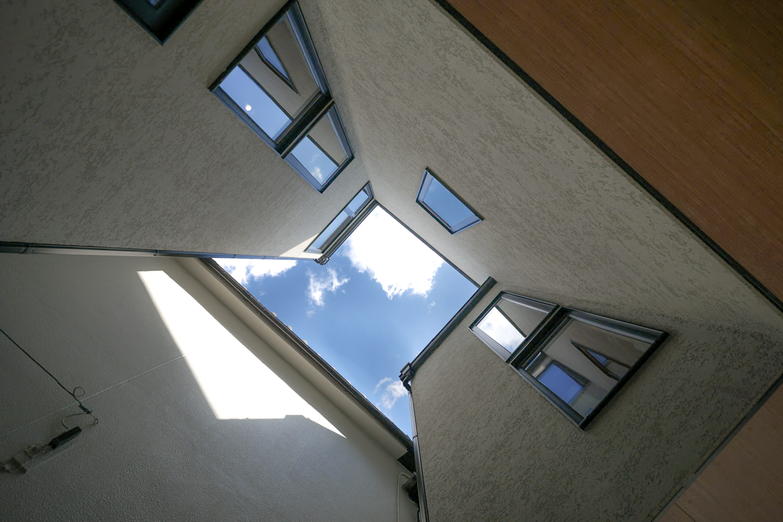 車庫の上は吹抜けに。各階に設けた窓から、風はもちろん部屋の奥まで光を届ける事が出来ます。実は家族の絆も繋ぐ大事な空間です。