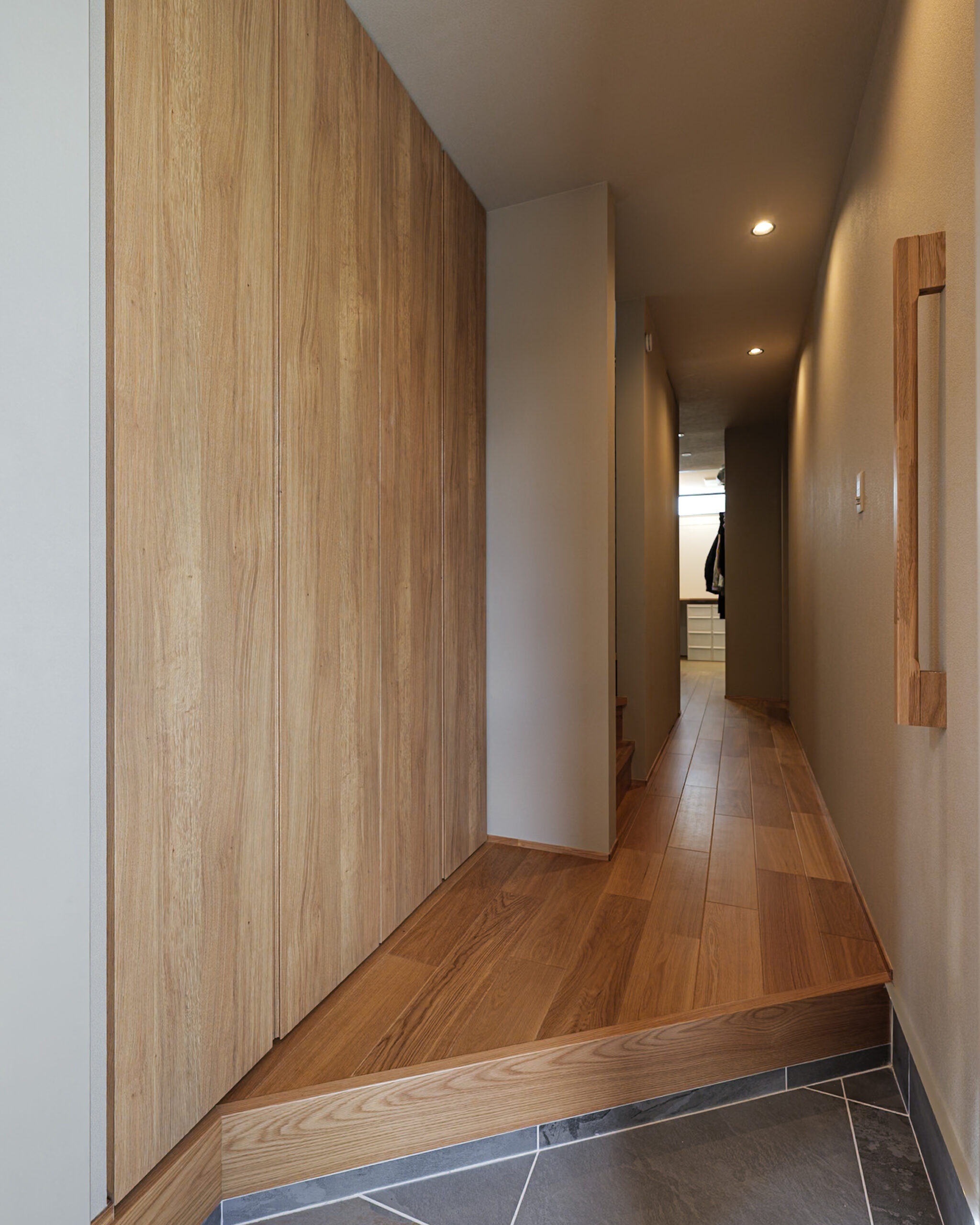 すっきりと伸びる動線が奥行きを生み、帰宅後すぐにホッとできる落ち着いた雰囲気に。