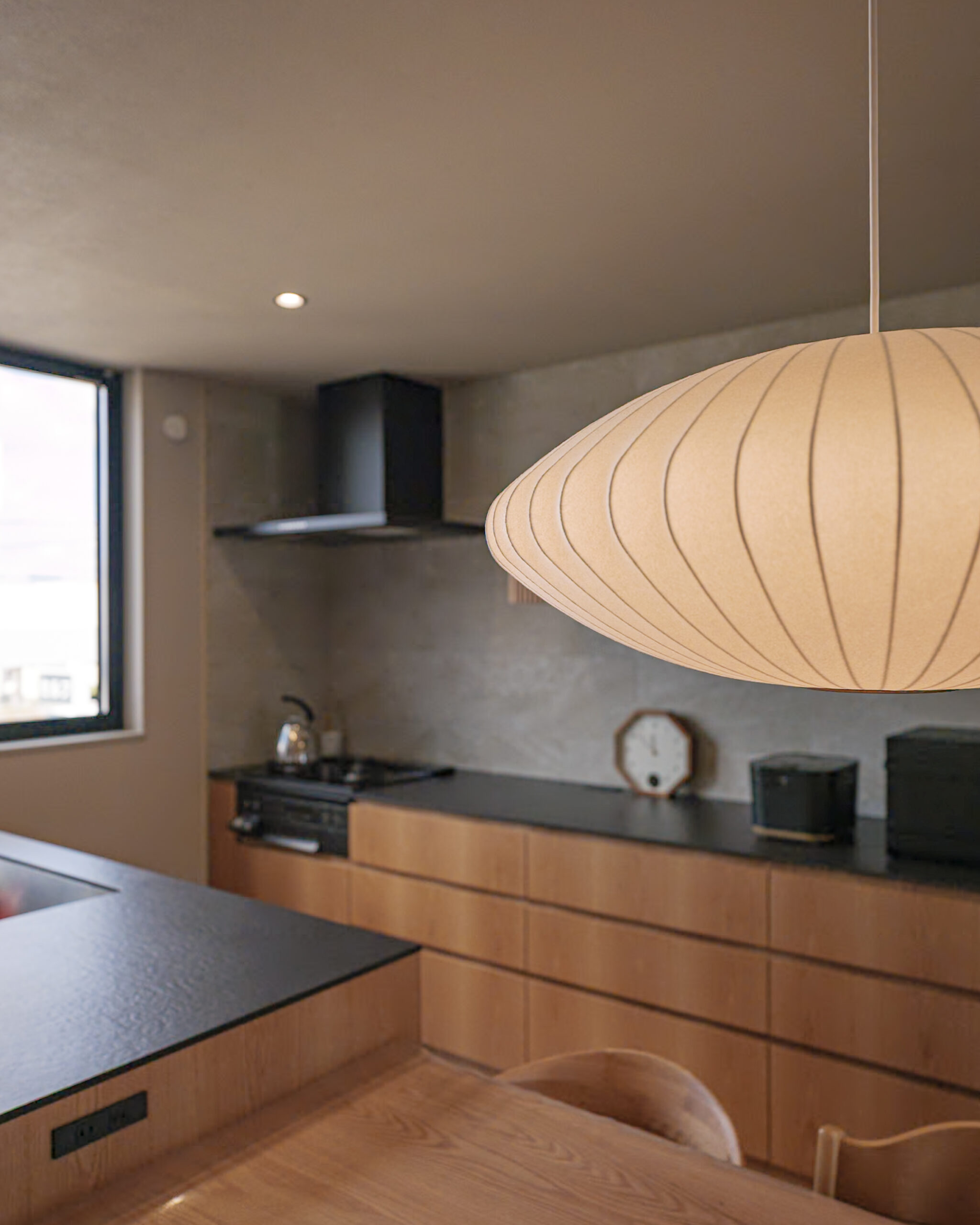 奥様こだわりの照明はお家の真ん中で家族を温かく見守ります。木の温もりに囲まれたキッチンに映えるお家を象徴するインテリアです。