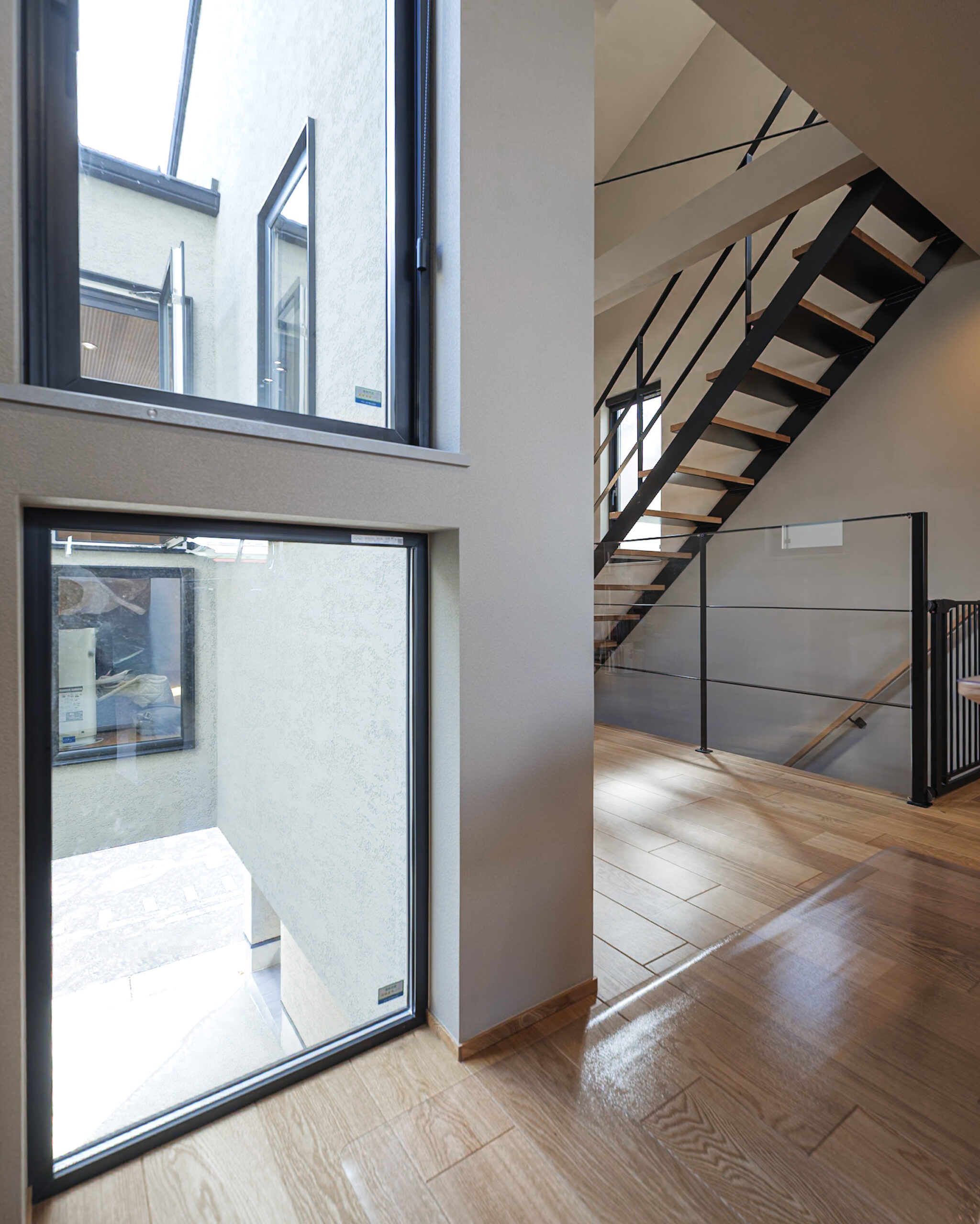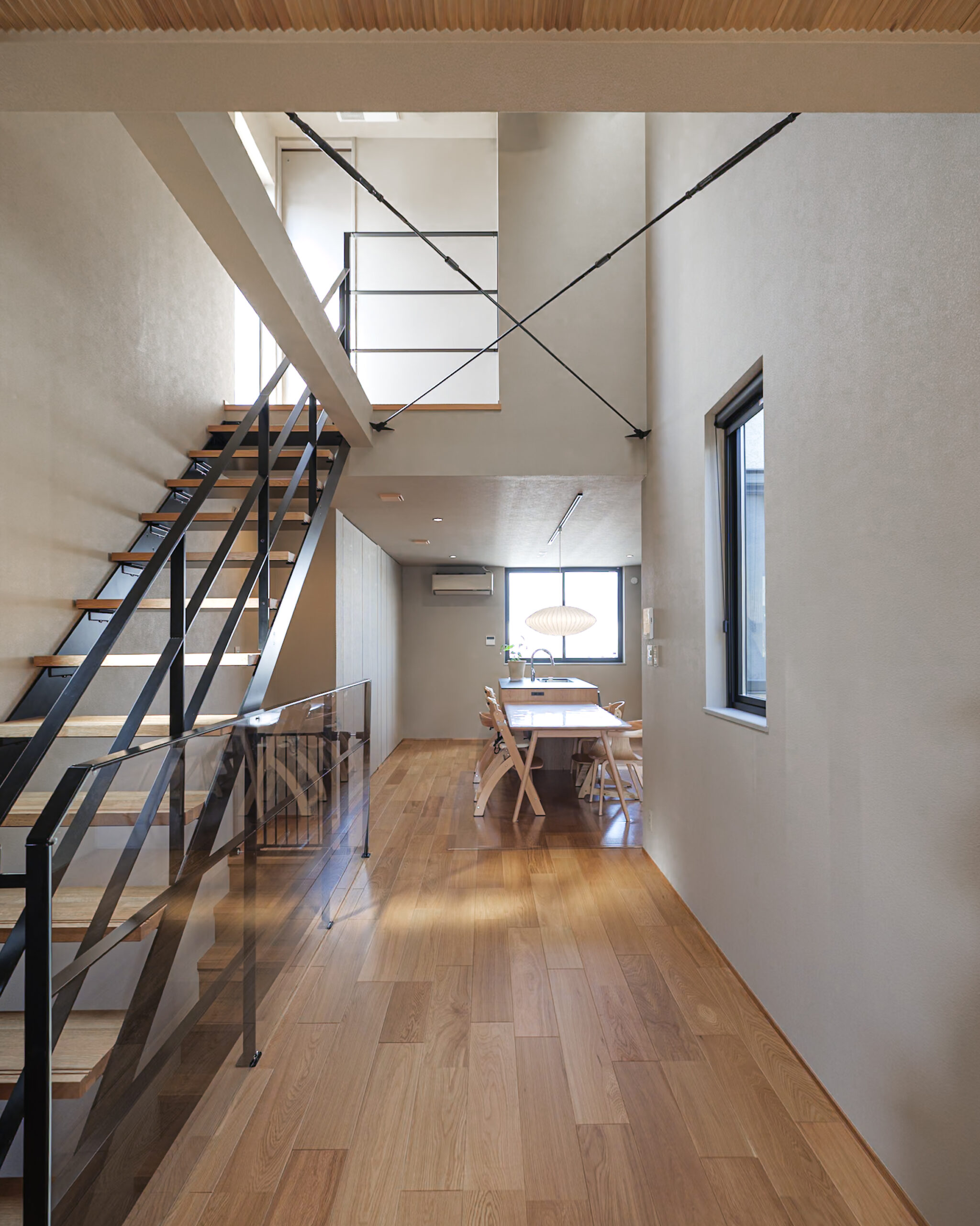 スチール階段のシャープなラインがアクセントとなり、洗練された雰囲気の中に温もりある木の質感が際立ちます。