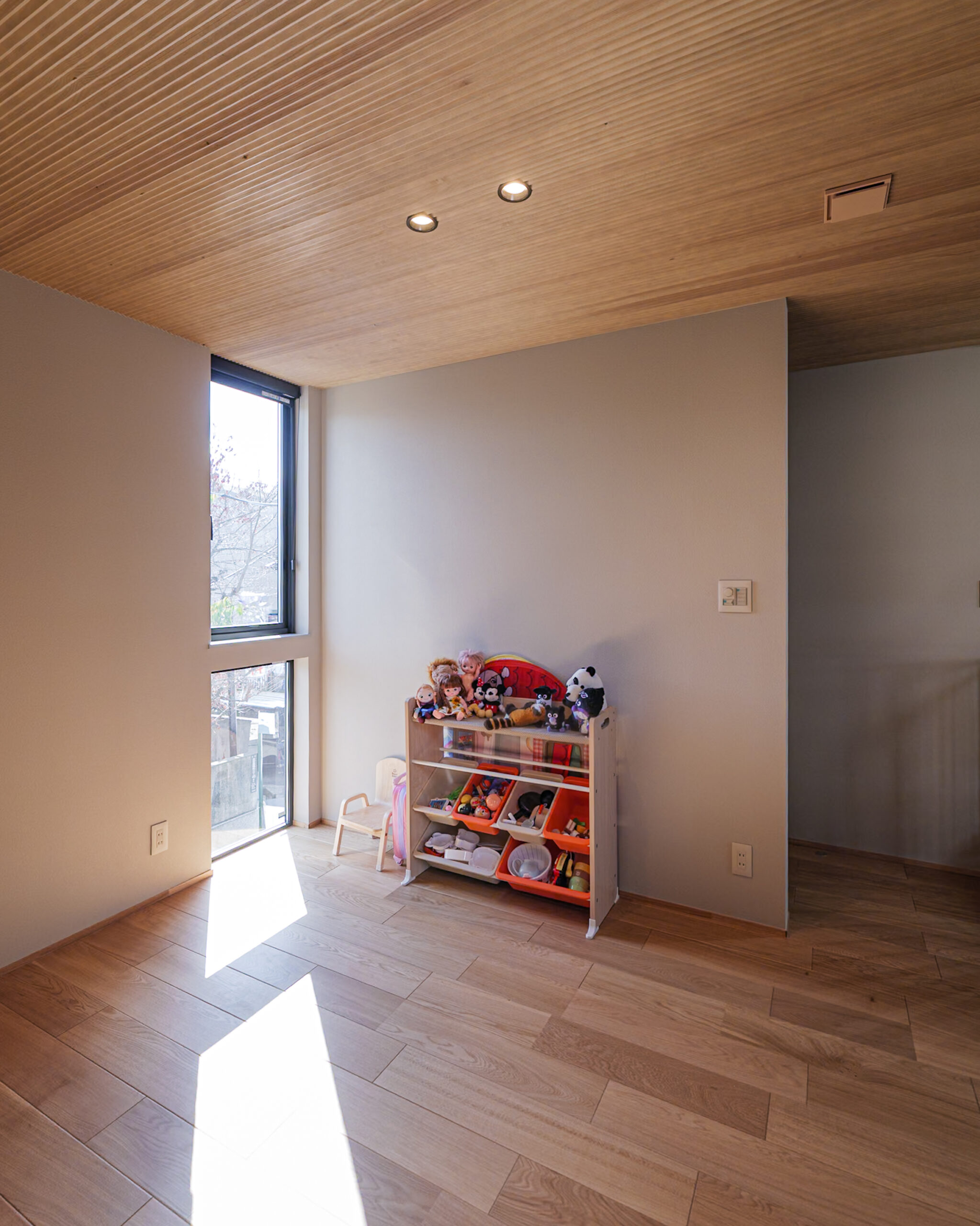 1階のガレージが見渡せる窓は、家族の帰りを一番に教えてくれる特別な空間。車がガレージに入ると、こちらの窓にお子様があつまり、『いってきます』と『ただいま』が聞こえてくる素敵な風景。