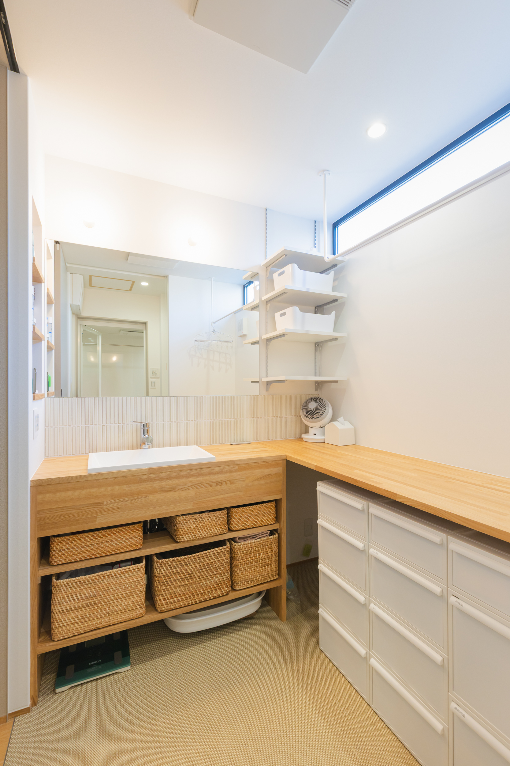たっぷりの作業スペースと収納を備えた、使いやすさ重視の洗面室。